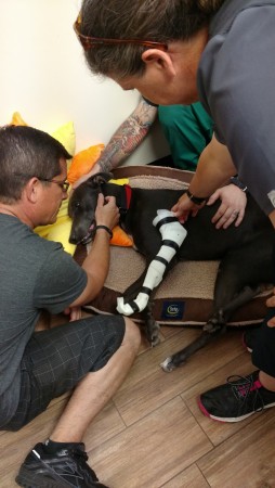 AGR explored many options to fix Earl's leg with a veterinarian and an orthopedic surgeon. All of them are expensive, but we want Earl to have a normal life. Amputating Earl's leg is much too drastic... we feel that would leave Earl without further choices. AGR has decided to work with Kate Titus, Owner of A Loyal Companion who is manufacturing a brace and orthotic for Earl. This will give Earl the ability to move, run, and play like the Greyhound he was meant to be!