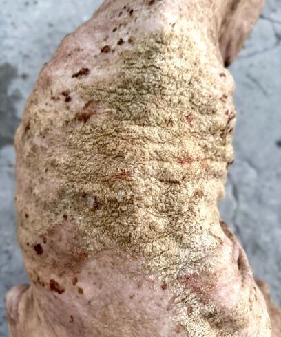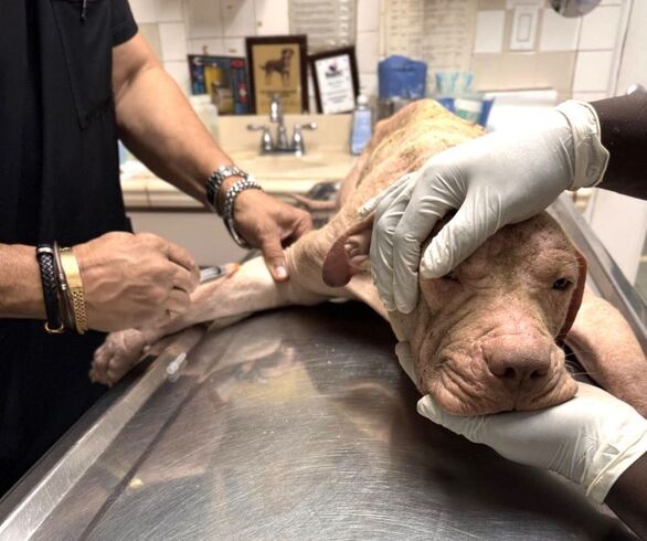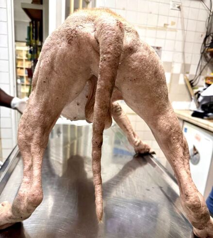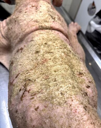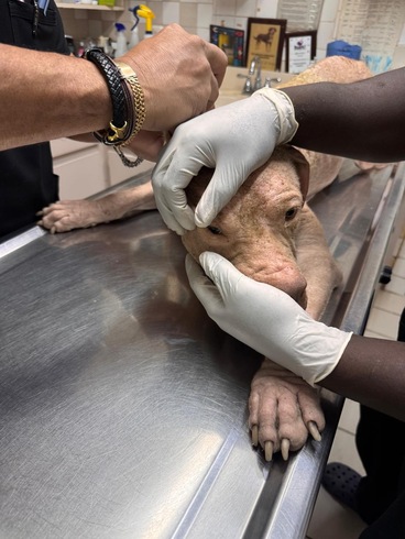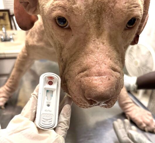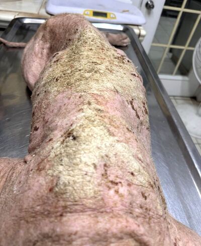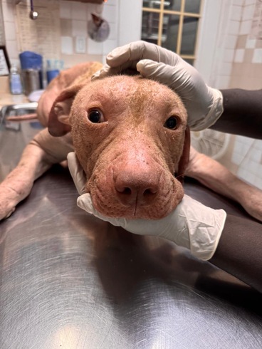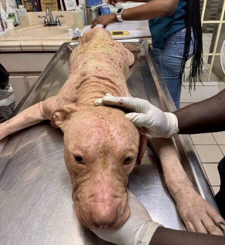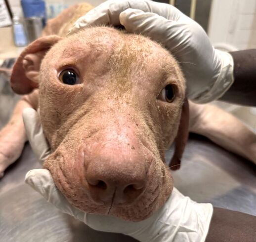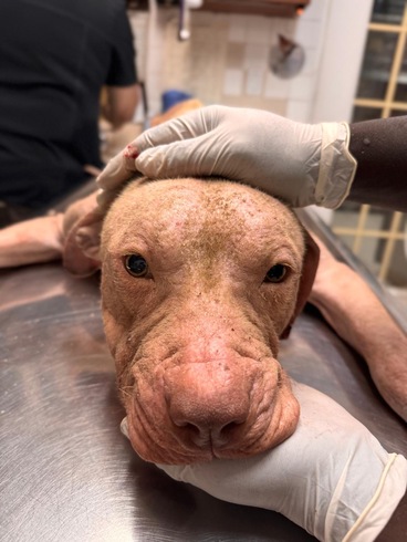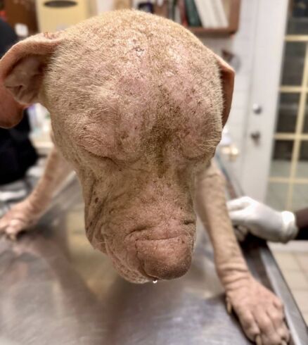 Cannoli has been diagnosed with sarcoptic mange, seborrhea, heavy parasite infestation, and heartworm disease. He will need to stay at the clinic for at least two weeks for medicated baths and treatment.