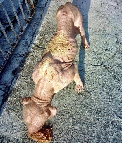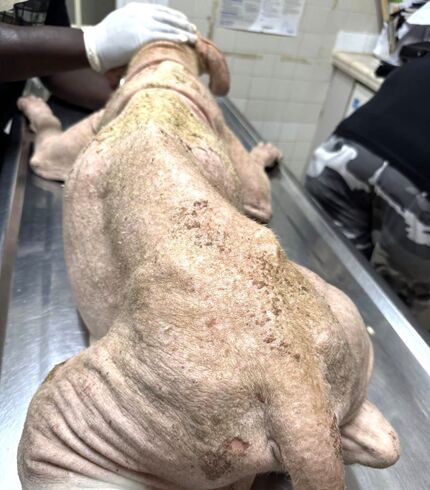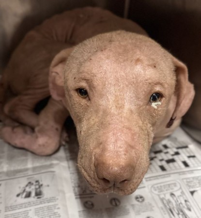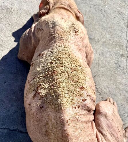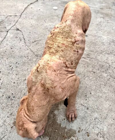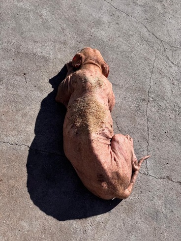 The "pink" dog, his skin was raw and inflamed from sarcoptic mange so severe that he had no hair left. His tiny body was baking under the scorching sun, and mosquitoes were eating him alive.