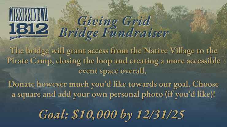 The Mississinewa Battlefield Society 501(c)(3) has been educating the public on local history for nearly 40 years. In 2024, we made the difficult decision to leave our home and seek ownership of permanent land. With the land purchase and the extensive projects to make it usable for our annual living history event, Mississinewa 1812, we are needing to raise funds to help the continuous growth of our event and organization.