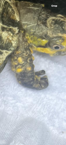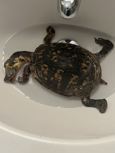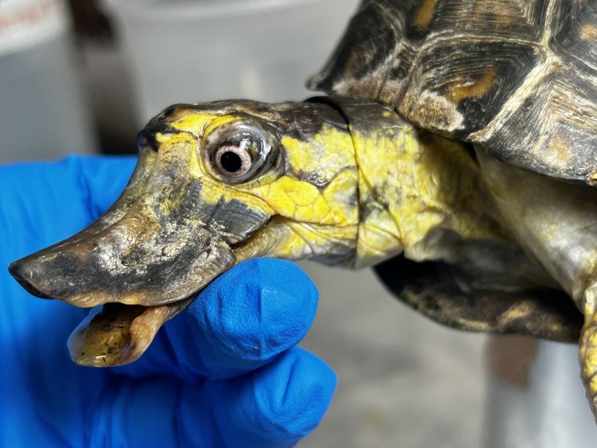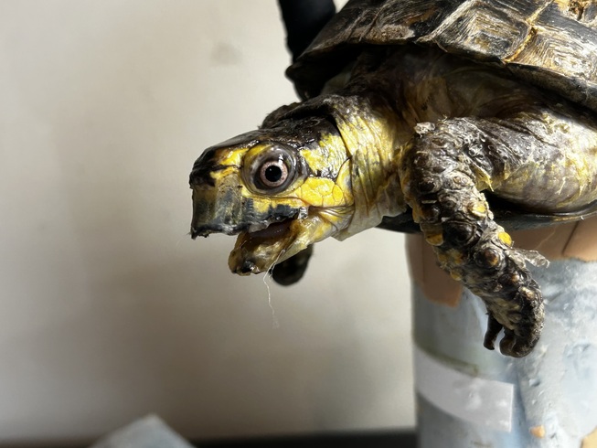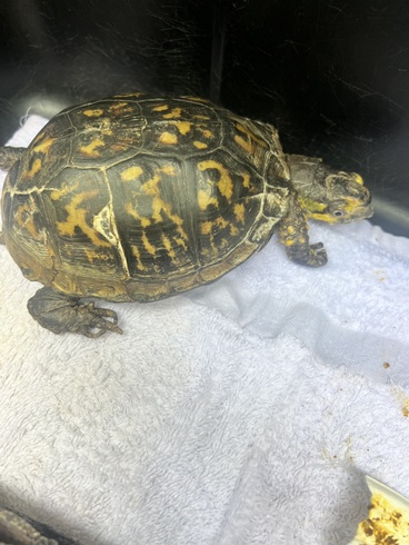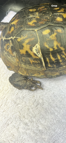70 YEAR OLD EASTERN BOX TURTLE that was a CAPTIVE PET(illegal). We received "Bubbles" from NYC after his keeper had passed away. He was fed beans and rice whole life. (They can not process grains and the antinutrients will leech any vital vitamins from their body) His deformity is due to chronic malnutrition and dehydration due to improper diet and husbandry. It did not allow him to easily drink or eat. His eyes are white compared to normal red (male) due to anemia.His legs can not support his own weight.He cant walk or eat on his own. The deformities will never reverse but we can make him more comfortable. Metabolic bone disease is painful.