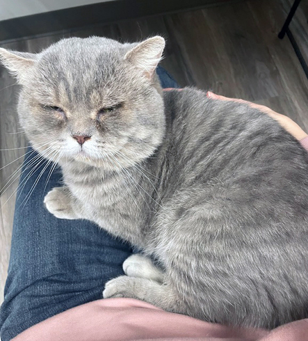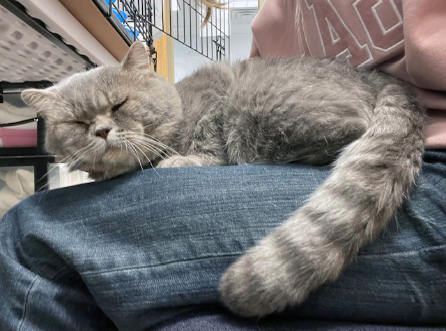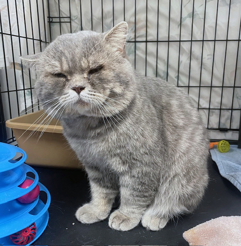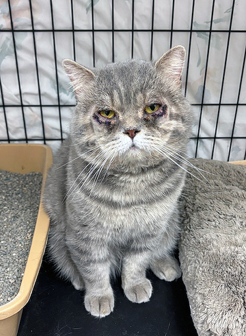 In October, Mooshie came to us from Woodridge. He had been around for awhile and clearly had Upper Respiratory. Because of being ill, he could not be neutered until he was healthier so he was started on antibiotics. His eyes were constantly gunked up, he was not eating and his gums were inflamed. In ten days of treatment – eye meds, oral antibiotics – his breathing was better, his eyes improved and even his gums were better! Persian mixes often have flat faces with short noses, making them susceptible to respiratory, dental and even eye issues. Mooshie clearly had entropion in both eyes – the eyelids fold inward into the eye, causing irritation and pain. On 11/3 he received his neuter, vaccinations, Convenia and entropion surgery in both eyes. Until we can be sure he will not rub his eyes, he has to wear an Elizabethan cone, frustrating him to say the least. Overall, he feels so much better! Eating very well, making happy paws and he can actually see now!