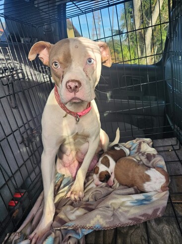 Today our Louisiana intake coordinator saw a post from a fellow rescuer about this Mom and her puppies. Yesterday, they were posted online stating "4 pups plus mom throw a number". A LA rescuer couldn't ignore that picture with the cramped family in a crate. She reached out and was told that there were originally 6 but was down to 4. She graciously paid $500 of her own money to get them to safety but when she got there, another puppy had passed.