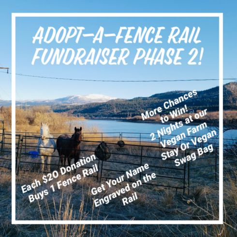 Our rescued farm animals need your help to build a safe and secure 3/4 acre fence along the river of our property. Thanks to many generous donations, we can go to Phase 2 to buy 210 wood rails (for safety, 3 rails are needed between each post). Each donation of $20 buys 1 rail. To show our thanks, your name will be engraved into the rail(s) you adopt and your name will be entered into a draw to win 2 night's accommodation for 1-2 people at our vegan guest house and farm stay, which includes a sanctuary tour to meet all the residents (estimated value $300, selected dates) OR win a swag bag of vegan goodies and products (of equivalent value).